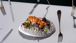 “Martinho e as estrelas” criado e manufaturada em território Caldense, é composta por um prato que representa um ouriço da castanha, com os seus tons e espinhos. Esta peça em faiança é vidrada manualmente nos tons dos óxidos alusivos à tradicional faiança das Caldas da Rainha. Estas peças são disponibilizadas em faiança colorida e em grés branco. A peça permite a lavagem na máquina de lavar e o uso do micro-ondas.