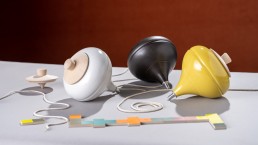 “O pião das Nicas” criado e manufaturado em território Caldense, é composto pela reinterpretação em faiança de um pião português. Produzido segundo a técnica de enchimento por via líquida coloridos em tons neutros mate e também em amarelo vibrante, o que lhe garante uma textura muito própria e à prova de água. O seu corpo é complementado com o bico em metal – alumínio. A tampa, que é também ela um pequeno pião, é torneada manualmente, As peças são feitas à mão, podendo apresentar pequenas variações.