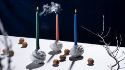 “Pilhas de luz” criada e manufaturada em território Caldense, é composta por um candelabro, representando uma noz, onde se potencia e valoriza a modelação manual e digital no seu processo de criação. Uma peça utilitária, em biscuit, completada por uma vela produzida numa empresa local. As peças são feitas à mão, podendo apresentar pequenas variações.